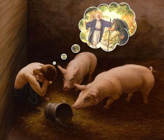 4- O perdão de Deus: O filho pródigo tem uma ideia errada sobre como DEUS perdoa, ele ensaia um discurso, não um discurso de arrependimento, mas um discurso baseado em si mesmo, se o dessem a comida dos porcos ele nunca teria voltado, ele quer comida, ele quer perdão, sem se importar com o Pai!